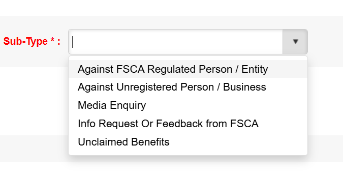 Via the website you are able to choose if it is a ‘compliant ‘ or ‘enquiry’ as well as if it is against a unregistered or registered FSCA regulated entity or person as well as other areas of enquiry.
